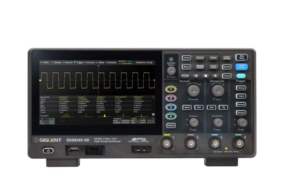 These oscilloscopes come equipped with tools such as History waveform recording, Search and Navigate functions, Mask Test, Bode Plot, and Power Analysis, enabling the capture, storage, and analysis of extended waveform records. Additionally, the SDS800X HD series offers an extensive range of measurement and mathematical capabilities, options for a 25 MHz arbitrary waveform generator, and support for serial decoding.
